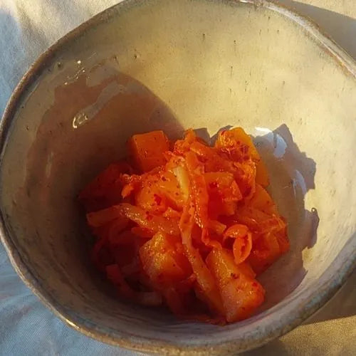 A seasonal alternative to napa cabbage Kimchi. Immerse yourself in the harmony of Korean seasonings and the sweetness of pumpkin, creating a probiotic-rich experience for optimal gut health.